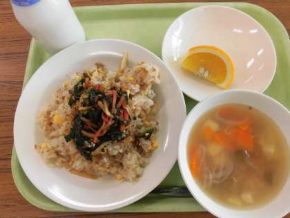 今日の給食は、ビビンバ・牛乳・ザーサイスープ・くだものです。