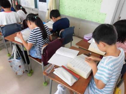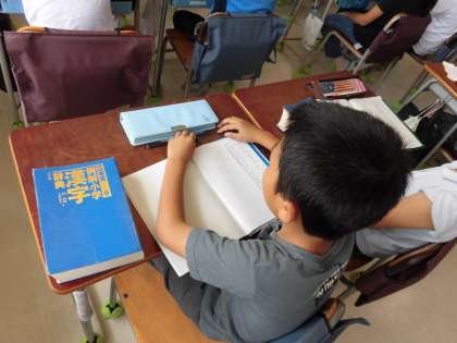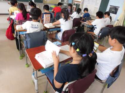 4年生の国語の授業の様子です。今日の学習は「漢字字典を使おう」です。漢字字典を利用して文字や語句を調べる方法を理解し、調べる習慣をつけることを目標に学習活動が進みました。一人1冊、漢字字典を手にしながら、みんな一生懸命に学習に向かっていました。