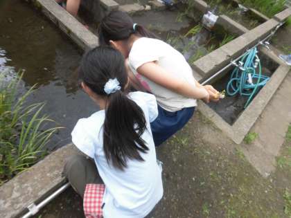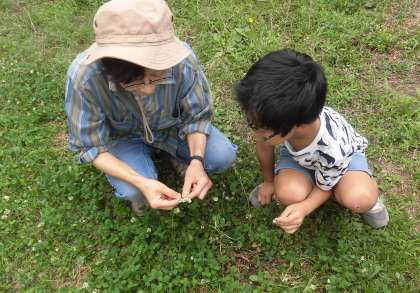 まだ少しだけ花を咲かせているシロツメグサで遊ぶ子供たちもいました。小さな子に優しく作り方を教えてあげる6年生もいました。田んぼの水の中の様子を観察している子もいました。ほほえましい光景が広がります。