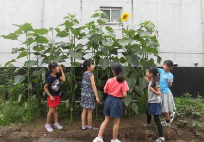 1週間ぶりにビオトープの活動がありました。ヒマワリがぐんと大きくなっていることに驚きの声を上げる子供たちがたくさんいました。思わず近寄って見上げます。「私たちより2倍あるかな。」「ひまわりの向きが太陽の方を向いているよ。」とたくさんの発見を伝え合っていました。
