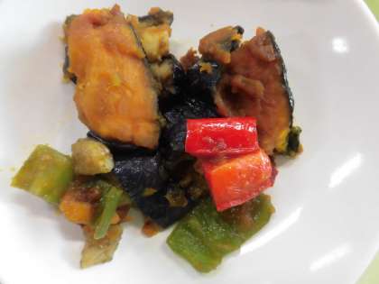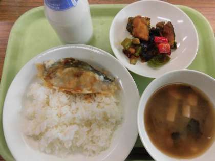 今日の給食は、ごはん・牛乳・魚の梅肉焼き・夏野菜の南蛮かけ・みそ汁です。