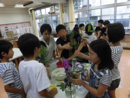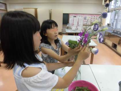 1学期最後の花を生ける活動。花を生ける手際の良さに驚きました。花を生けるセンスのよさにも感心しました。