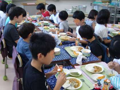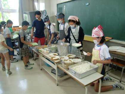 1学期最後のなかよし班活動は、交流給食と交流遊びです。給食は5・6年生が給食の当番活動の中心になって活躍しました。今日の献立はみんなの大好きなカレーです。学年の枠を超えて、楽しく、仲よく、給食をいただくことができました。