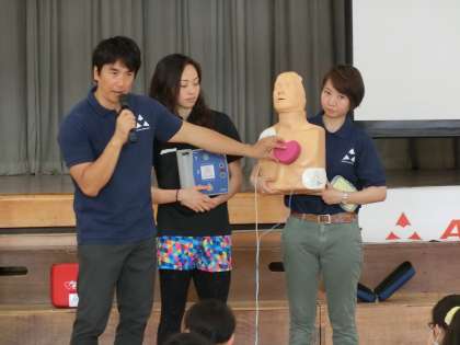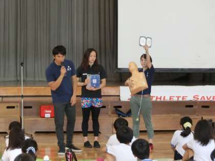 本物のAEDを見せていただきました。このAEDを多くの人があたり前に使える日本になるよう、飯沼選手をはじめ多くの皆様が普及活動を行っています。6年生の子供たちも、今日教えていただいた命の大切さを心にとめ、社会や多くの人たちと関わっていってほしいと心から願う、そんな1時間になりました。