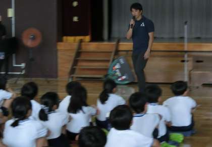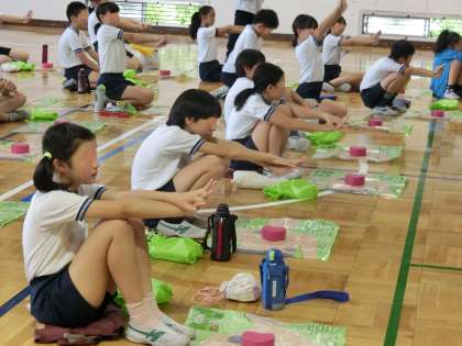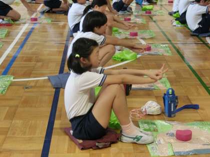 飯沼選手から、心臓マッサージを行う上で、大切なポイント教えていただきました。子供たちは飯沼選手の動きをしっかり見ています。お手本の動きを一緒に行い、練習を重ねました。