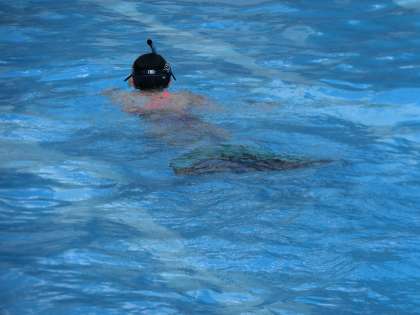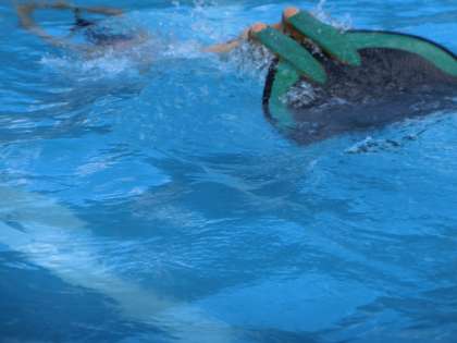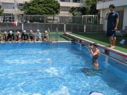 今日のもう一人のゲストティーチャーは松田志保選手です。松田選手はフィンスイミング日本代表の現役の選手です。優勝経験も豊富で金メダルをたくさん獲得しています。モノフィン種目の50メートルサーフィス、ビーフィン種目の50メートルCMASビーフィンの2種目で日本記録の保持者でもあります。日本選手権では出場全種目で優勝を果たしている才能あふれるアスリートです。今週末には世界選手権に出場するためにセルビアに遠征します。フィンと呼ばれる足ひれは5キロもあるそうです。学校のプールでそのすばらしい泳ぎを見せてくださいました。25メートルを8秒で泳ぐそのスピードにみんな驚くばかりです。
