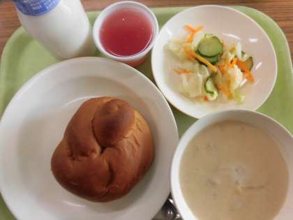 今日の給食は、黒砂糖パン・牛乳・マカロニのクリーム煮・コールスローサラダ・クランベリーゼリーです。