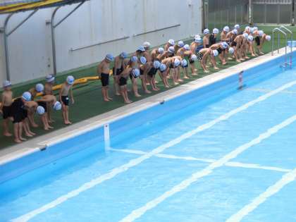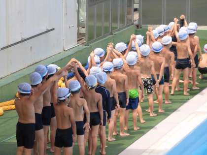 1・2年生の水泳学習の様子です。お天気に恵まれ、1学期最後の活動を存分に楽しみました。バディで安全確認を行った後、みんなではじまりのあいさつをていねいに行いました。1年生は初めてプールにある更衣室を使って着替えをしました。とてもしっかり整理されている更衣室に感心しました。