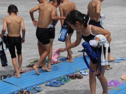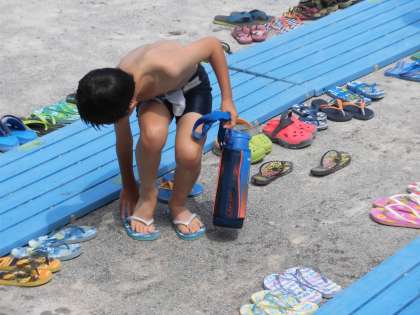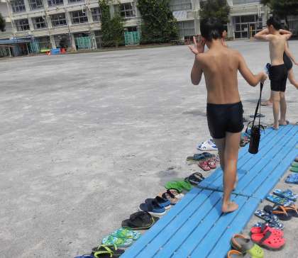 各地で高温が続く日本列島。水泳学習の際も熱中症への対策を行いながら実施しました。教室での指導体制を整え、検定が終わった子供たちから教室に戻りました。1学期最後の学習ですから、本来はしっかりと終わりのあいさつを行いたいところでしたが、子供たちの安全を最優先しました。プールサイドにも水筒を持っていきました。3・4年生が1学期最後の水泳学習を無事に終えることができ、ほっと安心しました。水筒持参のご協力ありがとうございました。