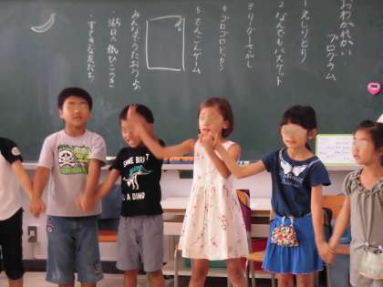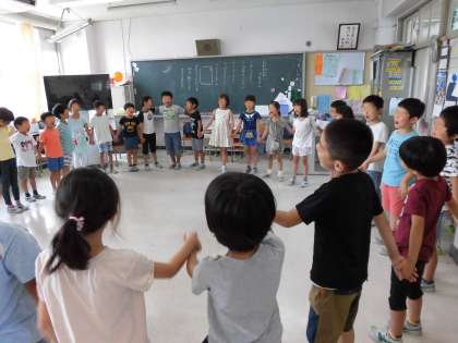 お別れ会の様子です。プログラムの中に「みんなで歌おう」がありました。「365日の紙ひこうき」「すてきな友だち」を歌いました。手をつないで、輪になって、子供たちの絆の強さを感じました。