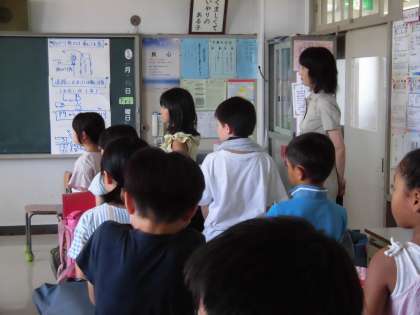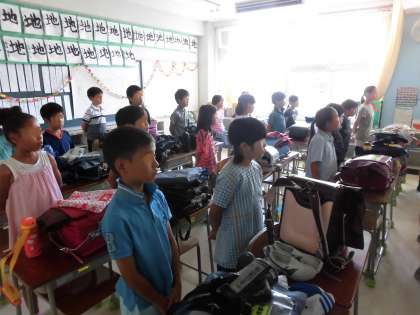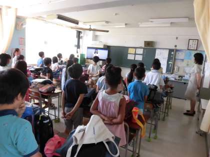 校内放送で終業式に参加する子供たち。真剣に参加していることが写真から伝わってきます。