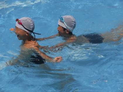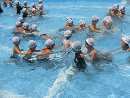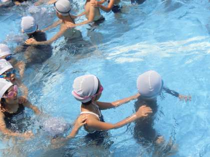 1年生は指導の最後に「じゃんけん列車」のゲームを行いました。じゃんけんもだんだん難しくなり、水面から水中へと移っていきます。みんな笑顔いっぱいです。