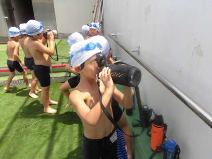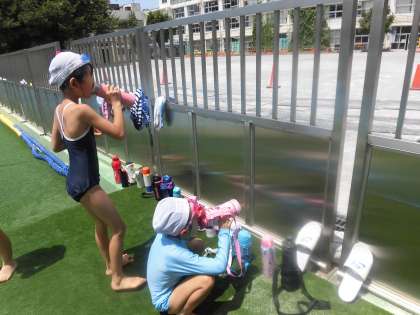 こまめに水分補給をするよう計画しました。プールから上がるたびに先生から、水分補給の呼びかけが行われました。子供たちもしっかり水筒の飲み物や水道から水分を補給しました。