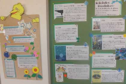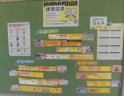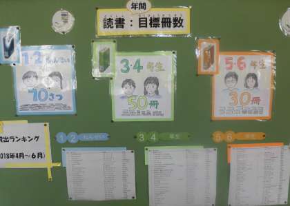 図書館の外、廊下の掲示板にも「課題図書コーナー」や「学年別目標冊数コーナー」「貸出ランキング」などがあります。機会があればぜひ、ご覧ください。一緒に本の世界に親しみませんか。