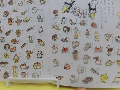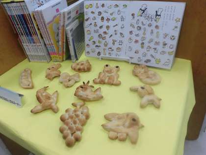池之上小学校の学校図書館の中に、たくさんのパンが描かれている絵本が飾られていました。絵本の前には手作りのパンも・・・