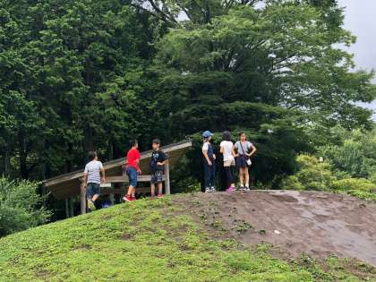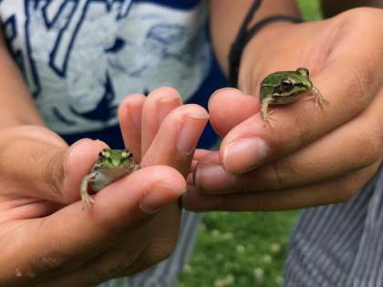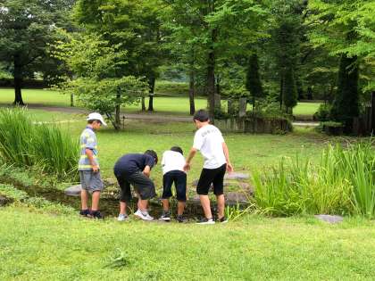 早く到着したため、11時まで自然の中で遊ぶ時間になりました。雨上がりのせいか、カエルをたくさん見つけて大喜びです。