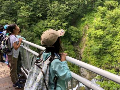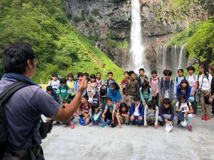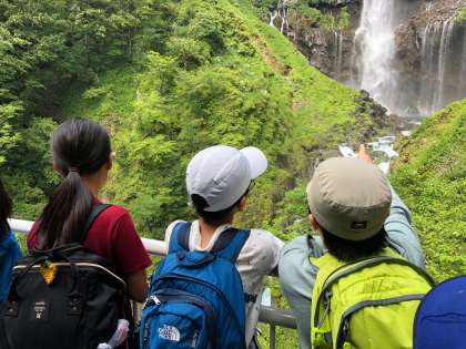 華厳の滝に着きました。日本三名瀑の一つとして有名です。100mメートル降りて滝を見学しました。ひんやりとした空気。青空と鮮やかな緑、そして雄大な滝を背景に集合写真を撮りました。