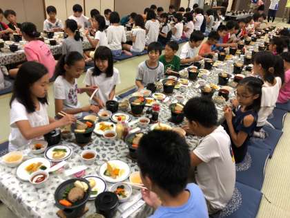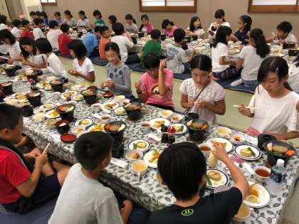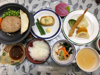 夕食の時間になりました。みんなの大好物のハンバーグとエビフライ。もりもり食べています。