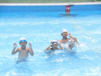 ウサギになったり、カンガルーになったり、イルカになったり・・・楽しみながら水慣れをする1・2年生です。水泳部のお兄さん・お姉さんがいつも優しく見守っています。