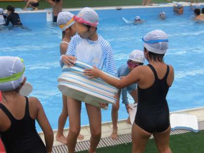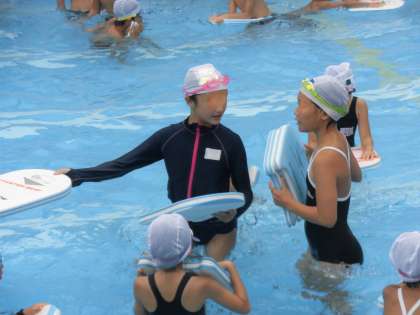 指導する先生の言葉を聞きながら、次はビート板を使いそうだなと判断すると、てきぱきとビート板を配る準備をしています。次の行動を想像しながら、自ら考えて行動する水泳部の子供たち。すばらしい判断力と行動力です。