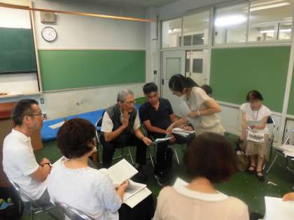夏休み直前の7月20日(少し前の研修会になりますがご紹介します)富士の学び舎合同研修会を開催しました。富士中学校・多聞小学校・代沢小学校・池之上小学校の4校の教員が一堂に会し、子供たちの学力向上のための授業づくりについて話し合いました。4月に行った「学習習得確認調査(世田谷区実施の学力調査)」の結果分析を各校が持ち寄り、教科ごとに話し合いを進めました。9月からの授業をよりよいものにしていくための研修会です。