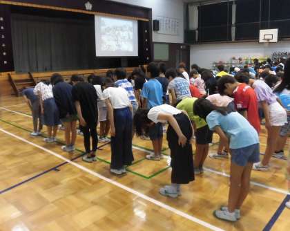 2学期最初の朝を迎えました。一生懸命に取り組んだ宿題を手に持ちながら、雨が降る中でしたが子供たちが元気に登校してきました。子供たちがいる学校はやはり活気にあふれます。9月1日・・・今日から2学期が始まりました。1時間目に始業式を行いました。しっかり整列をし、あいさつをていねいに行い、式がはじまりました。心地よい緊張感の中、お話をしっかり聞くことのできる子供たち。立派な態度でした。2学期、子供たちは様々なことにチャレンジしていきます。子供たちの活躍を精一杯見守っていきたいと思います。2学期もよろしくお願いいたします。