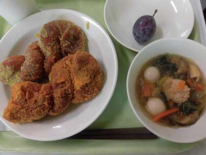 今日の給食は、2色あげパン・牛乳・肉団子入り春雨スープ・くだものです。