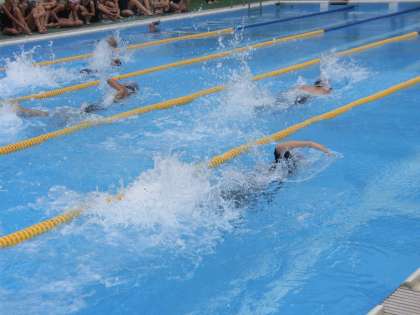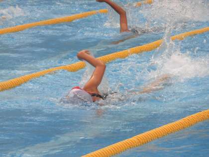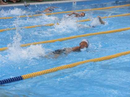 一生懸命に泳ぐ子供たち。自分の力への挑戦です。ゴールの瞬間の子供たちは皆、肩で息をしています。全力で取り組んでいることをうれしく見守りました。