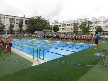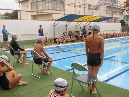 9月10日、5・6年生の水泳記録会が行われました。一人一人が自分の目標に向かって努力した水泳の時間。これまでの成果を発揮する大会です。「速く泳ぐことを目標にしながら取り組んだプールの時間。自分の欠点が見つかりました。その欠点を新たな目標にしてがんばりました。ターンの練習に力を入れました。」「自分の目標をたて、最後まであきらめずに努力を続けました。一人一人が目標をもってがんばってきました。今までの努力を成果にあらわしていきましょう」という代表の子供のすてきな言葉がありました。呼名の後の大きな返事、友達への応援も忘れません。スタートの緊張した顔。水の中で懸命に泳ぐ子供たち。がんばりがいっぱいつまった水泳記録会になりました。たくさんの保護者の皆様も応援してくださいました。ありがとうございました。