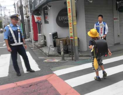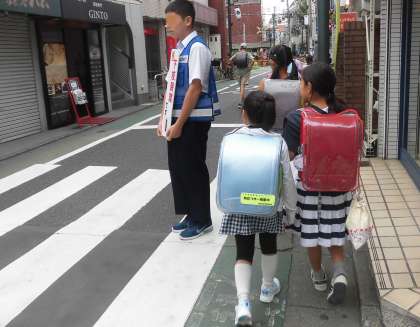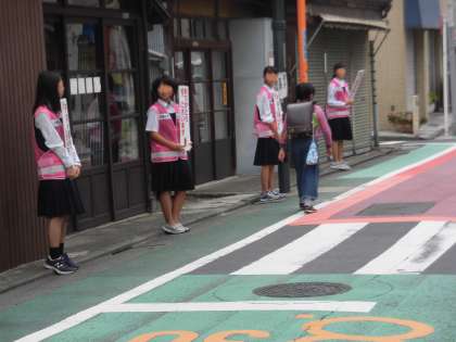 中学生たちも通学路に立ってくれました。安全運転呼びかけ隊のメッセージボードを持ち、ブルーとピンクのベストを着て、交通安全を呼びかけました。子供たちに「さようなら」としっかりあいさつもしてくれました。お互い緊張している様子もありましたが、池之上小の子供たちもしっかりあいさつを返していました。中学生とのふれあいの時間をもつことができました。