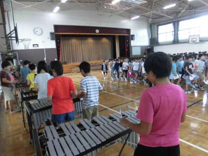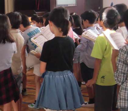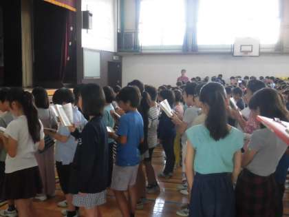 9月13日、9月の音楽朝会を行いました。9月の歌は「夏の日の贈りもの」です。とても美しい声が体育館に響きました。一人一人の歌声が集まって、みんなで創り出す美しいハーモニーを子供たちもきっと感じたことと思います。