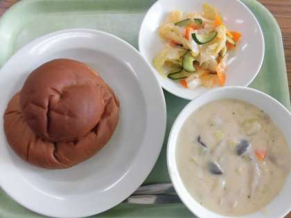 今日の給食は、ココアパン・牛乳・さつま芋シチュー・イタリアンサラダです。
