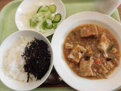 今日の給食は、ごはん・牛乳・ひじきのふりかけ・生揚げのそぼろあんかけ・野菜のひとしおです。