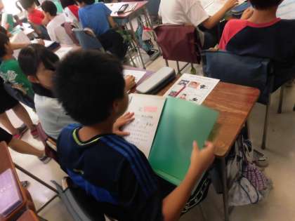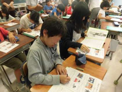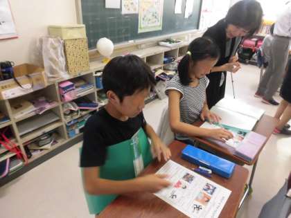池之上小学校では、授業の振り返りを大切にしています。特に外国語活動では、「言語面の気づき」と「内容面の気づき」が深まるよう、授業や教材を開発しています。子供たちも真剣にワークシートに取り組みながら、今日の授業の振り返りを行いました。この振り返りを次につなげていくとともに、1年間の子供たちの学びの積み重ねになるようファイリングをしています。