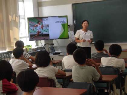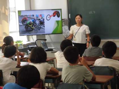 今日の授業は、「記録」に視点をあてながら、2桁の数字を使って、英語を聞いたり伝えたりする活動をたくさん取り入れました。スポーツ選手の記録から、オリンピック・パラリンピックにつなげていきました。昨年度、本校で授業をしてくださった、パラリンピアンの佐藤圭太選手も登場しました。