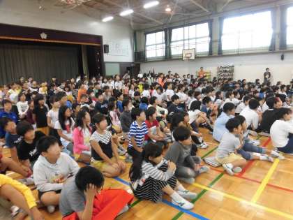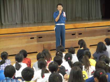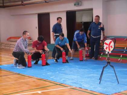 区の防災課の方から消火器の使い方を教えていただきました。まず最初に先生たちが消火器の使い方を訓練します。先生の訓練の様子を子供たちが見守ります。