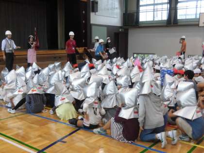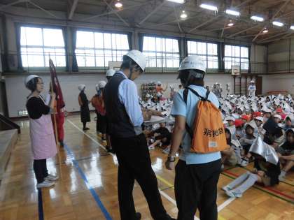 体育館に集合した子供たち。先生たちの人員確認が続きます。子供たちは静かに全員の確認が取れるまで待っています。とても立派な態度です。