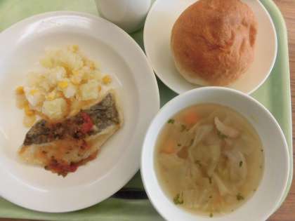 今日の給食は、米粉パン・牛乳・魚のラビゴットソース・コーンポテト・野菜スープです。