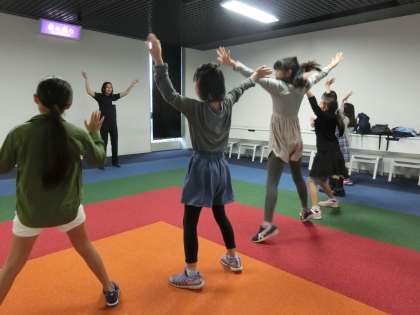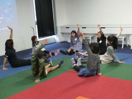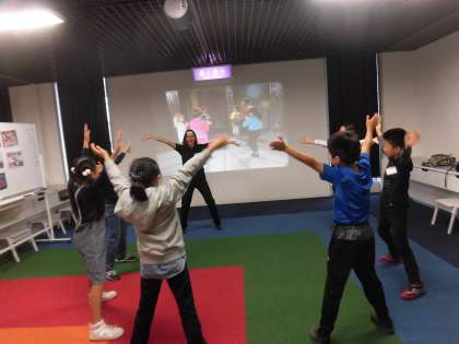 「異文化の歌と踊りコーナー」の様子です。このコーナーでは、英語の歌を歌ったり、外国の音楽に合わせてダンスをしたりして、異文化を体験しました。はつらつと踊る子供たち、体いっぱいに楽しさを表現していました。