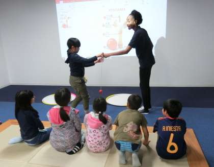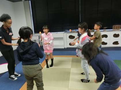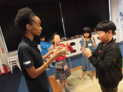 「日本文化体験コーナー」の様子です。このコーナーでは、日本らしい風景を背景に、伝統的な遊びや玩具などを楽しみながら、日本文化を英語で紹介し合いました。あやとり、お手玉、けん玉などを体験しなら、外国の先生とコミュニケーションする子供たち、楽しそうに活動していました。