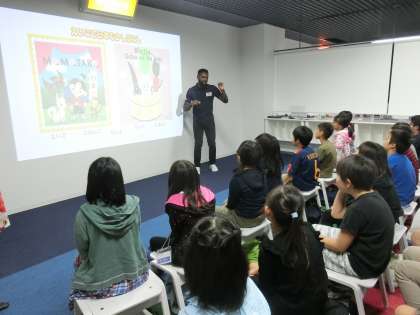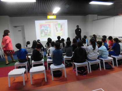 クラス全員で絵本の読み聞かせを聞きました。DVD絵本の映像を見ながら、外国人の先生が質問したり、絵本の表現を一緒に発音したりしました。絵本は「Ninjin,Gobo and Daikon」です。とも楽しいお話で子供たちは絵本の世界に引き込まれました。これまでの体験や知識を結びつけながら、お話の世界に出てくる英語をとてもよく聞き取っていました。子供たちの力の大きさに驚かされました。英語の発音もとてもきれいです。