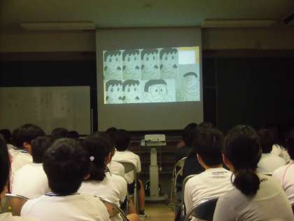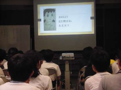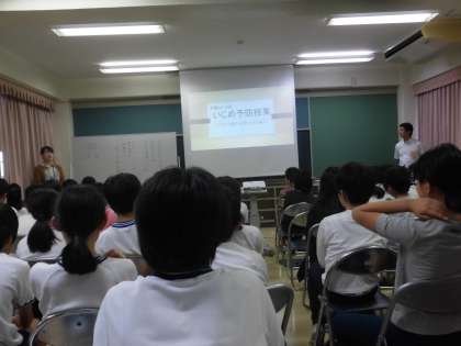 『いじめ』について考えました。先生は、具体的に『いじめ』につながる様々な行動や、いじめられる子の気持ち、そしていじめる子の気持ちを伝えてくださいました。ドラえもんの登場人物の心を覗き込みながら、子供たちと『いじめ』の構造について考えていきました。先生はおっしゃいました。「人の心にはコップがある。そのコップに悲しみや不安の水が1滴1滴注ぎ込まれる・・・コップの水があふれたとき、人はつらく悲しい気持ちを抑えて、歩き出す力を失ってしまうことがある」と。最初の1滴もあれば、途中の1滴もある。あふれる瞬間の1滴もある。どの1滴が悪いのかと考えるのではなく、多くの人が、その1滴にならないようにしようと、相手を思いやることが大切。1滴を注ぎ込むのではなく、1滴をすくってあげることもできる。「おはよう」「大丈夫」と声をかけることもコップの水をすくい出すことにつながる。そして、みんなができることは・・・と真剣に伝えてくださいました。子供たちも真剣に聞いていました。「いじめを今すぐ止められなくてもいい。でも困っている人に一声かけられる人になろう。」「いじめなんかと闘わなくてもいい。自分で抱えきれないときは近くの大人に力を借りよう。そしていつか誰かを助けられる人になろう。」「いじめという道具が必要とされる場面はない。いじめという道具を使うことが許される場面もない。」とても大切なことを考える時間になりました。