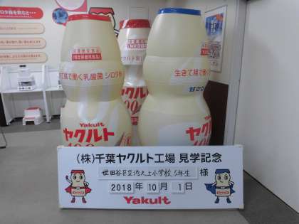 2つ目の見学場所は「ヤクルト工場」です。到着すると最初にヤクルトをいただき、みんなでおいしく飲みました。その後はDVDを視聴したり、工場の方から製品ができるまでの様子をうかがったりしながら楽しく学習しました。そして・・・工場内の見学です。写真で様子をお伝えすることはできませんが、みんな一生懸命にお話を聞いていました。子供たちは初めて知ることに驚いたり、様々な工夫を見つけ出したり、熱心に学習に臨むことができました。