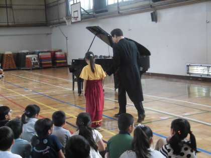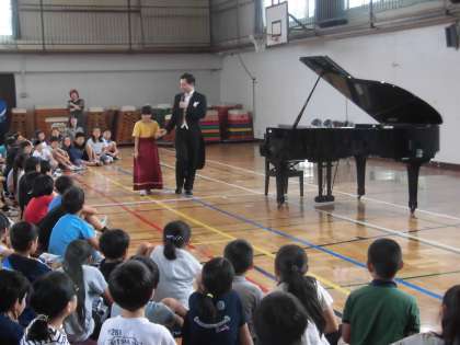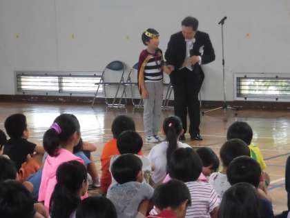 ポロネーズのリズムに合わせて歩きました。子供たちが着させていただいた王子様とお姫様の衣装は、なんと竹内先生の手作りだそうです。少し照れくさそうでしたが、友達の前で堂々と歩けました。竹内先生は次のように子供たちに伝えました。「チャレンジすることが大切。みんなの前でも自分を信じてやってみよう。」みんなの代表として手を挙げてくれた子供たち、がんばりました。