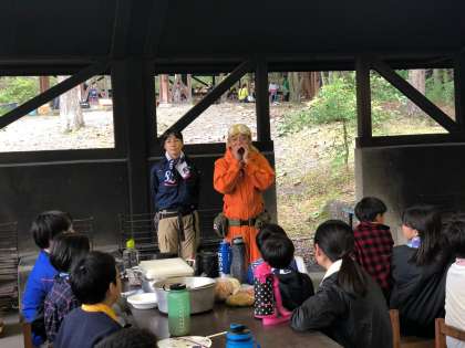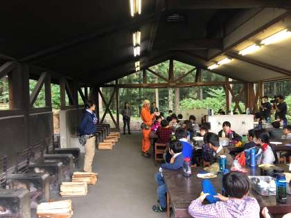 3時、カレー炊飯がはじまりました。豊かな自然の中にある飯ごう炊飯場です。補助員の方から安全の話、カレーの作り方、火の起こし方など詳しくご指導いただきました。いよいよカレー作りがはじまります。