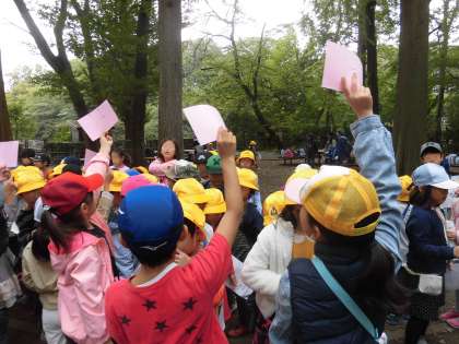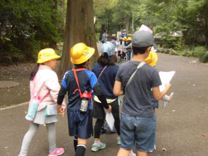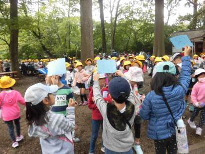 今日の遠足の目標の一つは、「1年生と2年生の交流」です。2年生が一つ上のお姉さん、お兄さんとしてがんばります。班ごとの整列も2年生が活躍しました。