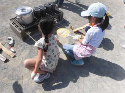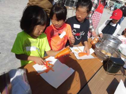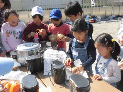 10月20日、秋晴れの中、池之上小学校校庭で「野外子ども会」が開催されました。主催は、青少年代沢地区委員会です。多くの地域の皆様、保護者の皆様、区の職員の皆様が準備・運営を行い、子供たちに楽しいひとときを・・・そんな願いから生まれた活動です。富士の学び舎4校である代沢小学校・多聞小学校・池之上小学校・富士中学校の子供たちが集まり、カレー作りに挑戦しました。器用に野菜を調理し、火にかけていきました。