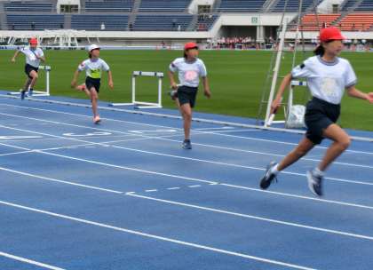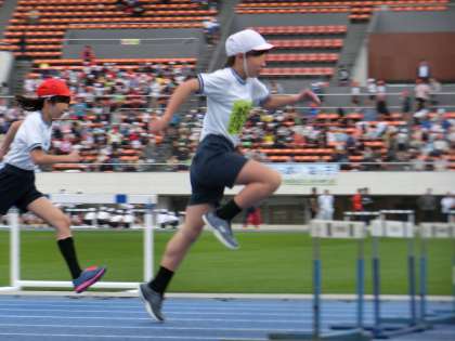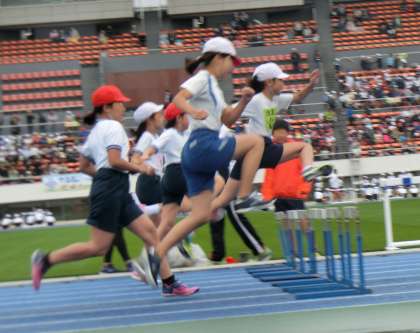 ハードル走もがんばりました。3枚目はリレーの様子です。どの学校も精鋭の選手たちです。白熱した走りに応援の声がグランドに響き渡りました。6年生は、互いのがんばりに声援をたくさん送っていました。先生も子供たちを精一杯応援しました。保護者の皆さまからもあたたかな応援をいただきました。ありがとうございました。