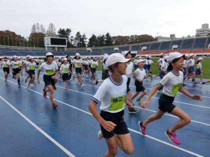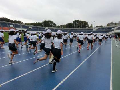 プログラムはエンジョイランニングから始まりました。大きなトラックを音楽に合わせて力いっぱいに、そして楽しみながら走りました。