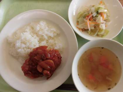 今日の給食は、ごはん・牛乳・豆腐入りハンバーグ・野菜ソテー・コンソメスープです。